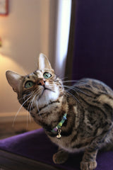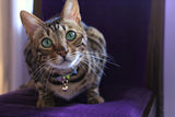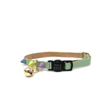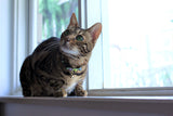 Luxurious hand-painted studded leather collar that is super comfortable to wear yet tough enough to keep up with the demands of an active cat. You may notice your cat strutting in this collar but your cat won't. They'll barely notice it's there! It features a safety breakaway buckle, gold bell and adjustable slider for the perfect fit.