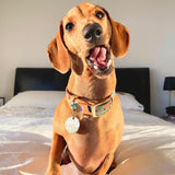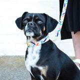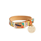 The most cheerful, multi-colour hand painted leather collar. Made of lightweight yet durable vegetable-tanned leather, finished with gold hardware. Finished off with a Nice Digs charm. Each piece is unique.