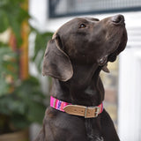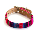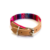 These luxury dog collars are handmade from soft Inca style blankets woven in Bolivia. Bright pink fabric, trimmed with thick vegetable tanned leather.