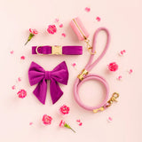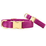 A luxe collar crafted from soft, sumptuous plush purple velvet. The perfect accessory for dress-up occasions, but also durable enough for everyday wear. Made with soft natural fabric on the inside and outside, ideal for sensitive pups. Nylon webbing core to withstand a thousand pounds of pull and luxe metal hardware make this a strong and stylish collar.