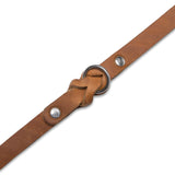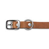 Greased leather dog collar with braiding details in caramel brown with stainless steel hardware.