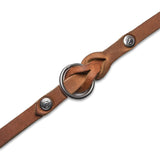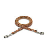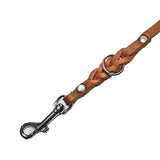 Greased leather dog leash with braiding details in caramel brown with stainless steel carabiners and studs.