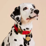 A luxe collar. The perfect accessory for dress-up occasions, but also durable enough for everyday wear. Made with soft natural fabric on the inside and outside, ideal for sensitive pups. Nylon webbing core to withstand a thousand pounds of pull and luxe metal hardware make this a strong and stylish collar.