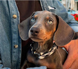 *Collar pictured on white background is size large. Please note this is only available in 1.2 or 1.5 cm thickness for Toy Breeds as picured with Dog Model: Instagram @tito_bebe_teckel