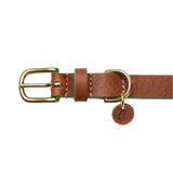 A glorious leather dog collar for medium to large dogs made from genuine vegetable tanned cowhide in cognac brown with contrast detailing in bright green. See Prince Park for small dogs.