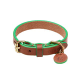 A glorious leather dog collar for miniature and small dogs from genuine vegetable tanned cowhide in cognac brown with contrast detailing in bright Green. See Kings Park for large dog breeds.