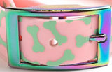 A light pink coloured dog collar with your choice of classic brass or rainbow chrome hardware. Designed for adventure dogs and those that like to play in the mud or roll in the grass. A highly durable, waterproof dog collar with coated webbing. Choose your size and which hardware you would like to match it with.